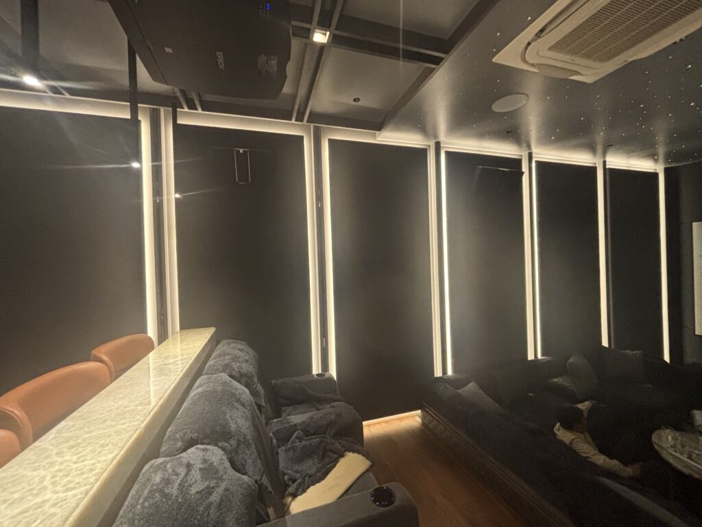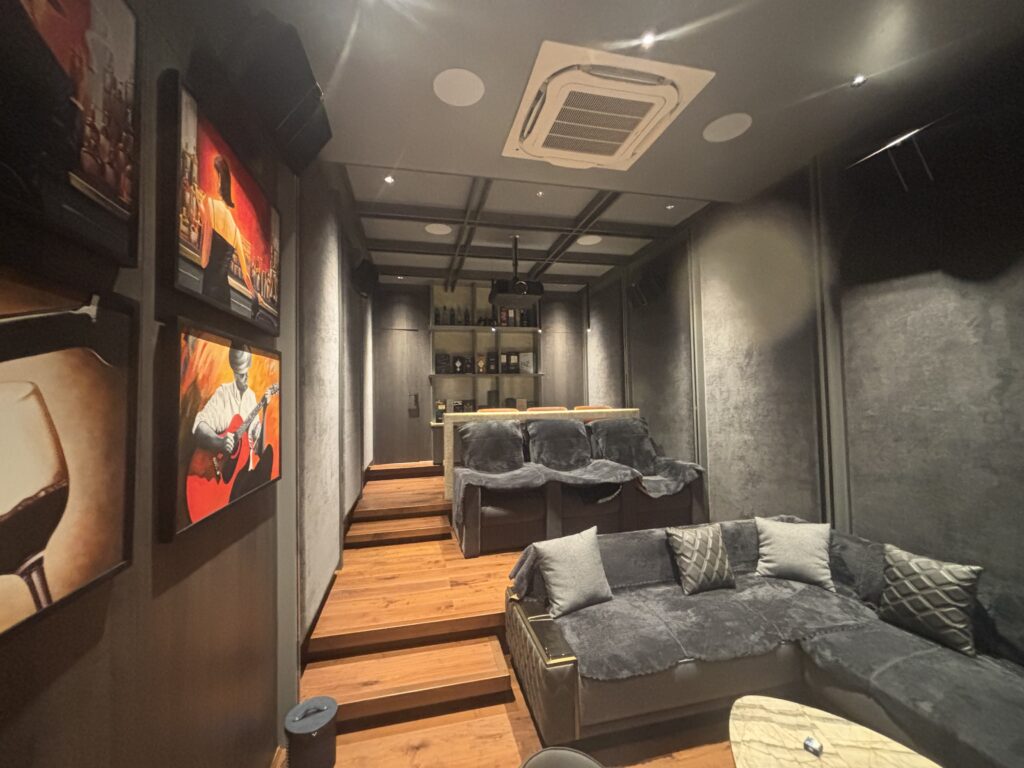 The design approach was centered around what we call “Stealth Performance,” where high-end engineering disappears into a minimalist aesthetic. A grey-themed interior was chosen not only for its luxurious appeal but also for its ability to enhance visual contrast for projection while seamlessly integrating acoustic treatment. The layout was carefully engineered into three functional zones: a front row with casual sofa seats & a middle Area with 3 motorized cloth fabric recliners from living sedia and a rear bar section with three bespoke chairs, transforming the back of the room into a social hub without compromising audio immersion.