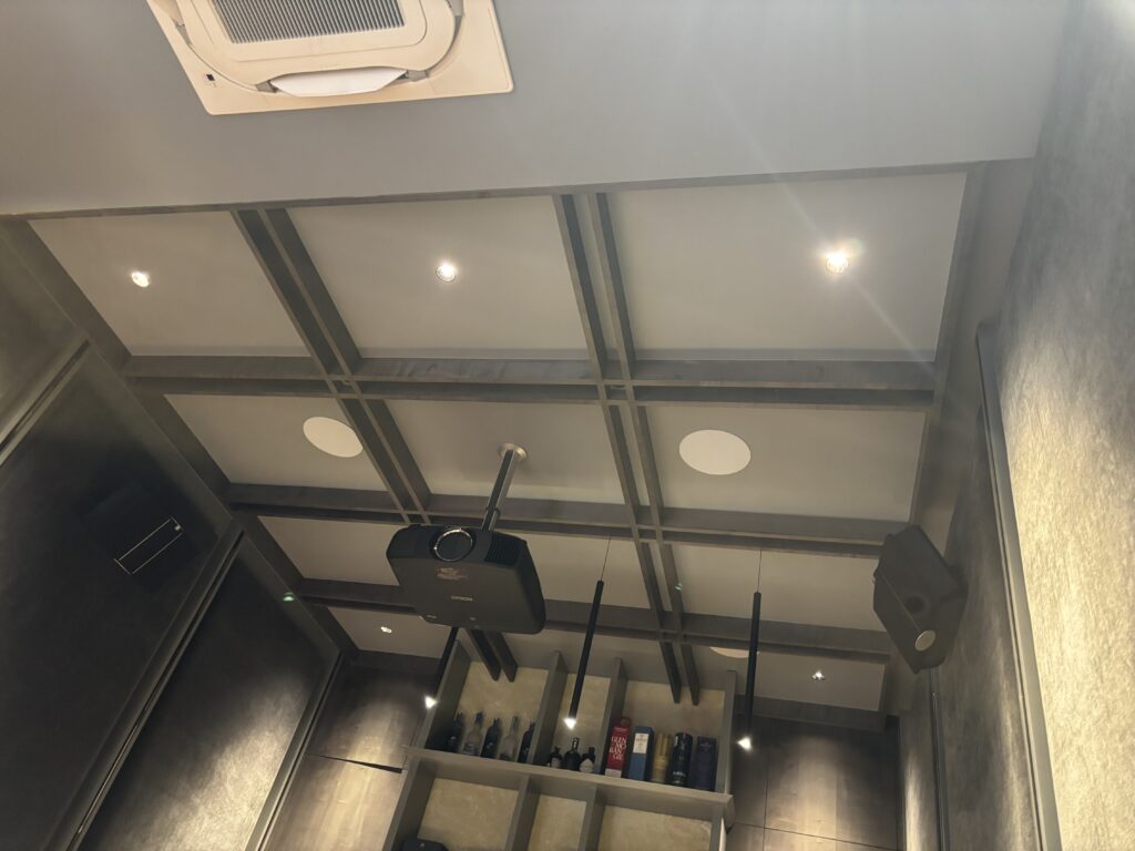 - The Solution: We utilized the client’s SUR Dipoles. These create a diffused, ambient sound field. This ensures that the “middle casual” seating row feels enveloped in the atmosphere without being distracted by a localized speaker “pointing” at them.