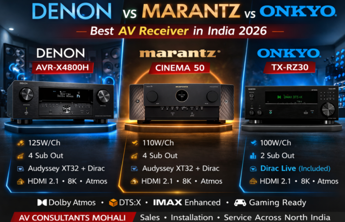Author avconsultants Published on: March 9, 2026 Best AV Receiver in India 2026: Denon X4800H vs. Marantz Cinema 50 vs. Onkyo TX-RZ30 At AV Consultants Mohali, we specialize in premium home theatre installations across Chandigarh, Punjab, Delhi NCR, Haryana and Himachal Pradesh.